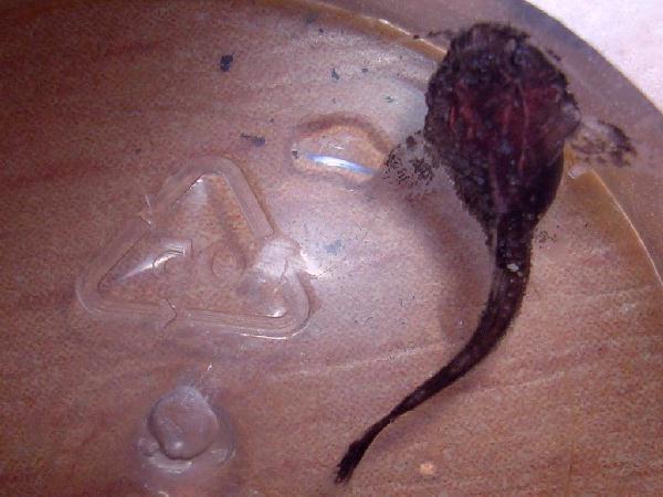 Eines Tages nun, es war der 16.April 05, sah ich einen Brati fressen. Nichts Ungewöhnliches mag nun so mancher denken, aber ich habe an diesem Tag noch nichts zum Futtern ins Becken gegeben. Nein. Der Brati hatte ein Baby gefressen. Nun ging ich mit dem Stiel meines kleinen Keschers auf Suche. Und da waren sie! KDA-Aufzuchtkasten ins Becken und mit der "Rettung" der Babies begonnen. Einen habe ich gleich zum Knipsen in einen 30ml Messbecher gegeben. Das Recyclingzeichen auf dem Foto ist 5mm groß.