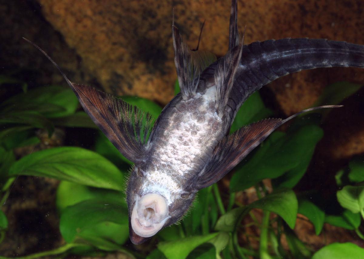 Ventralseite mit Fleckenzeichnung. Eine dem abgebildeten Sturisoma aureum ähnliche Zeichnung ist auch möglich. Beachte auch die langen Brustflossenfilamente.