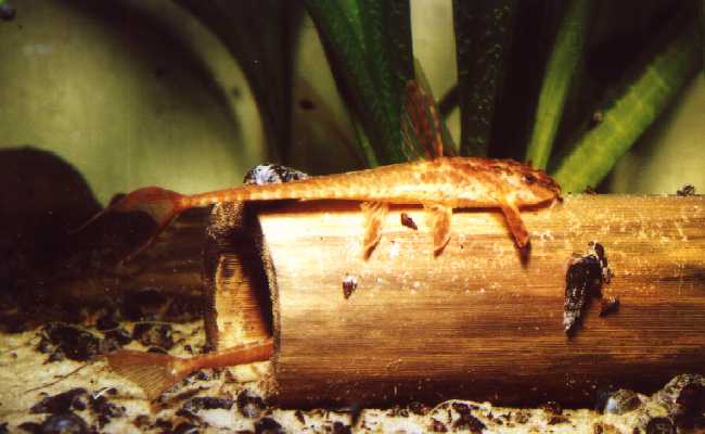 Die erwähnte Truppe von 10 adulten Tieren ist in einem Becken mit den Bodenmaßen 100 x 50 sehr gut aufgehoben. Leider kommt es vor, dass sich die Männchen gegenseitig stören und am laichen hindern. Ich habe mich daher angewöhnt, lieber nur Pärchen oder Trios zur Zucht anzusetzen. Sind mehrere Weibchen Laichbereit, so laichen diese nacheinander mit dem selben Männchen ab und die Gelege sind entsprechend groß. Um dem Männchen die nötige Ruhe zu geben, setze ich es mitsamt der Röhre in ein kleines Aquarium um, wo die Jungen gefahrlos schlüpfen können. Das Männchen benötigt während der Brutzeit kein Futter, kommt jedoch bei Futtergabe in der Dämmerung zum Fressen heraus. Bei Einzelhaltung des Männchens füttere ich nicht bis zum Schlupf. Danach jedoch bekommt das Männchen etwa eine Woche lang das beste Futter, bevor ich es zu den bereits wieder Laichvollen Weibchen zurücksetze. Die jungen sauge ich mit einem Luftschlauch von der Scheibe ab und setze sie in einen kleinen Aufzuchtbehälter um, in dem ich sie besser anfüttern kann.