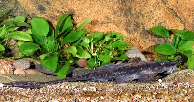 Das vierzehn Zentimeter lange Männchen hatte gar keinen hellen Bauch! Kopfschüttelnd nahm ich zur Kenntnis, daß Sturisoma aureum ein wunderschönes Wurmlinienmuster auf dem Bauch haben kann. Was lernen wir daraus? Schreib niemals gutgläubig irgendwo ab! In diesem Fall keine große Katastrophe, Ähnliches hat aber dazu geführt, daß heute alle "Segelflossenstörwelse" grundsätzlich als Sturisoma panamense verkauft werden. Ein kleines Problem ergibt sich allerdings: Auch Sturisoma festivum können ein ähnliches Muster zeigen, weshalb dieses Merkmal nicht isoliert zu betrachten ist.