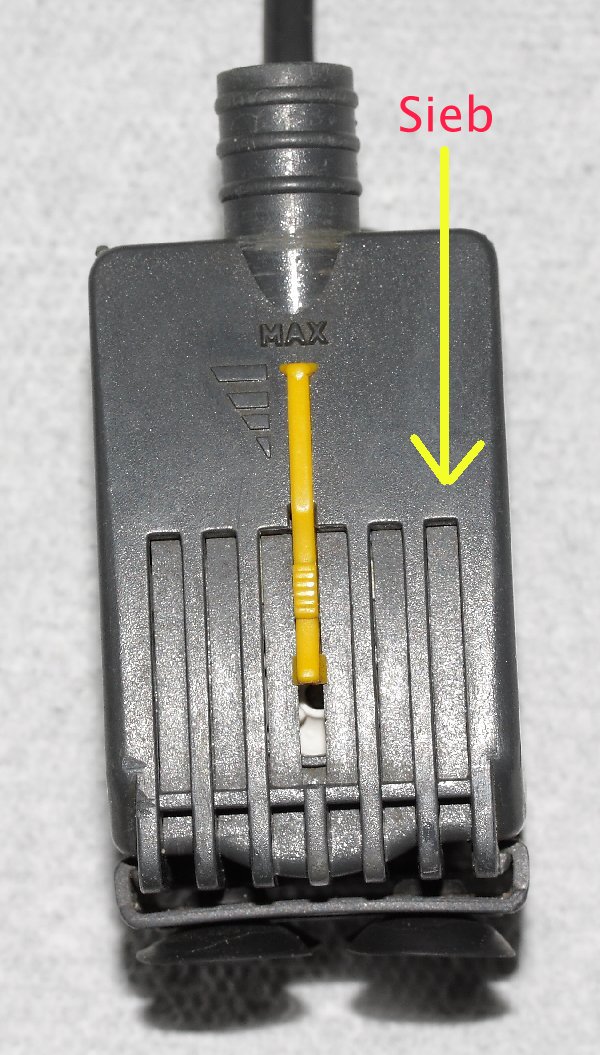 Das Sieb vor dem Ansaugstutzen verstopft aber relativ leicht (kleine Turmdeckelschnecken, Pflanzenreste etc.) und muss